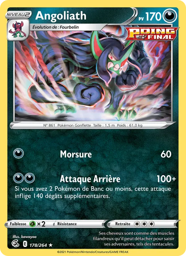 100+Si vous avez 2 Pokémon de Banc ou moins, cette attaque inflige 140 dégâts supplémentaires.