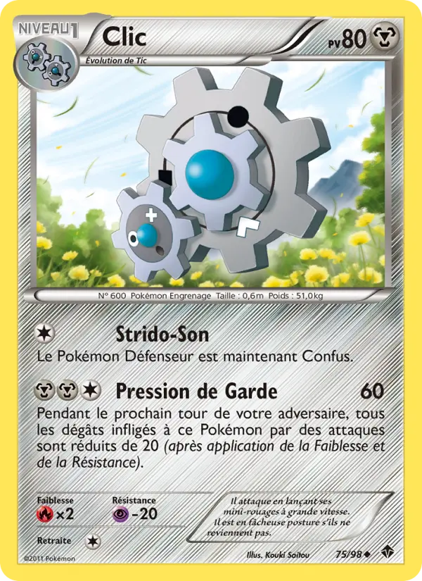 60Pendant le prochain tour de votre adversaire, tous les dégâts infligés à ce Pokémon par des attaques sont réduits de 20 (après application de la Faiblesse et de la Résistance).