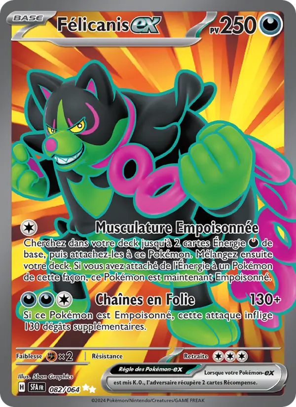 Cherchez dans votre deck jusqu'à 2 cartes Énergie {D} de base, puis attachez-les à ce Pokémon. Mélangez ensuite votre deck. Si vous avez attaché de l'Énergie à un Pokémon de cette façon, ce Pokémon est maintenant Empoisonné.