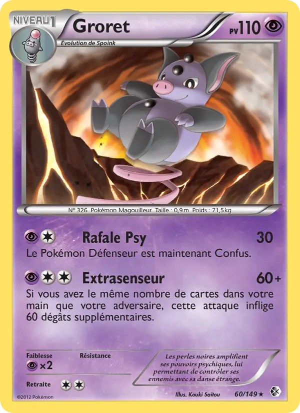 60Si vous avez le même nombre de cartes dans votre main que votre adversaire, cette attaque inflige 60 dégâts supplémentaires.