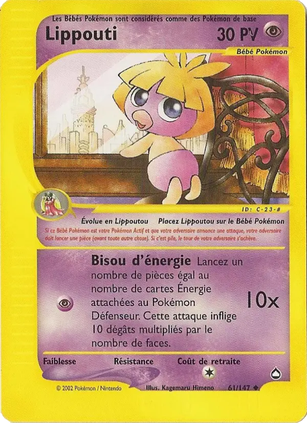10xLancez un nombre de pièces égal au nombre de cartes Énergie attachées au Pokémon Défenseur. Cette attaque inflige 10 dégâts multipliés par le nombre de faces.
