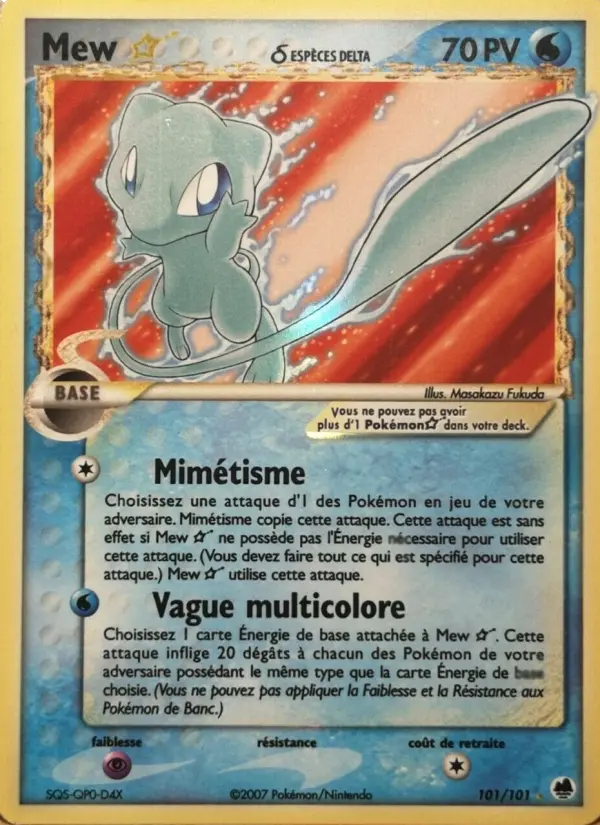 Choisissez une attaque d'1 des Pokémon en jeu de votre adversaire. Mimétisme copie cette attaque. Cette attaque est sans effet si Mew ne possède pas l'Énergie nécessaire pour utiliser cette attaque. (Vous devez faire tout ce qui est spécifié pour cette attaque.) Mew utilise cette attaque.