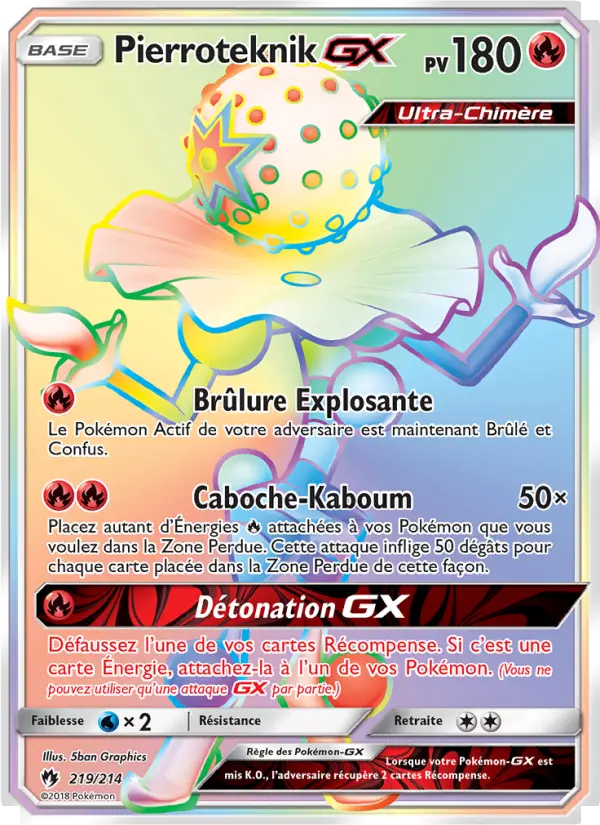 50×Placez autant d’Énergies Fire attachées à vos Pokémon que vous voulez dans la Zone Perdue. Cette attaque inflige 50 dégâts pour chaque carte placée dans la Zone Perdue de cette façon.