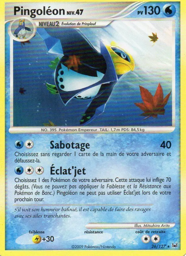 Choisissez 1 des Pokémon de votre adversaire. Cette attaque lui inflige 70 dégâts. (Vous ne pouvez pas appliquer la Faiblesse et la Résistance aux Pokémon de Banc.) Pingoléon ne peut pas utiliser Écras'jet lors de votre prochain tour.