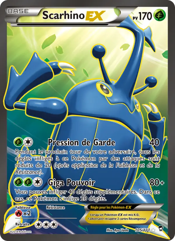 40Pendant le prochain tour de votre adversaire, tous les dégâts infligés à ce Pokémon par des attaques sont réduits de 20 (après application de la Faiblesse et de la Résistance).