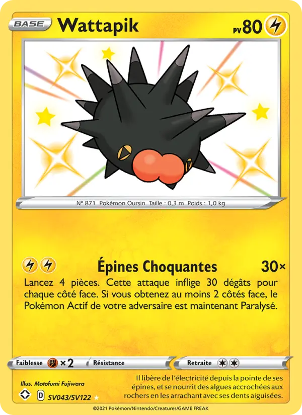 30×Lancez 4 pièces. Cette attaque inflige 30 dégâts pour chaque côté face. Si vous obtenez au moins 2 côtés face, le Pokémon Actif de votre adversaire est maintenant Paralysé.